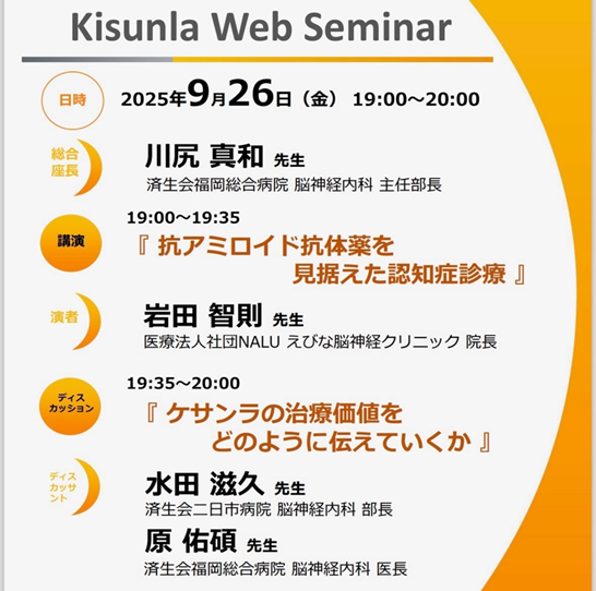 Kisunla Web Seminarに参加しました。福岡よりWeb配信されました。以前、済生会福岡総合病院で御一緒させて頂いた、済生会福岡総合病院 脳神経内科 主任部長 川尻真和 先生、脳神経内科 医長 原佑碩 先生、済生会二日市病院 脳神経内科 部長 水田滋久 先生と役割者として参加しました。抗アミロイド抗体薬(主にケサンラ)の初期導入と地域連携に関する講演をさせて頂き、その後、四人でディスカッションさせて頂きました。以前、お世話になったメンバーとの会であり、とても懐かしい気持ちになりました。Web参加して頂いた九州在住の多くの先生方に感謝申し上げます。