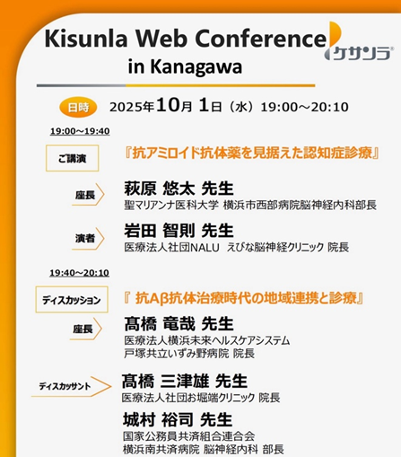 Kisunla Web Conference in Kanagawaに参加しました。MMよりWeb配信されました。聖マリアンナ医科大学 横浜市西部病院 脳神経内科 部長 萩原悠太 先生に座長をして頂き、抗アミロイド抗体薬(主にケサンラ)に関する講演をさせて頂きました。共通の知り合いの多くいる萩原先生と交流が持てて非常に良かったです。戸塚共立いずみ野病院 院長 高橋竜哉 先生の司会で、萩原先生、お堀端クリニック 院長 高橋三津雄 先生、横浜南共済病院 脳神経内科 部長 城村裕司 先生とディスカッションに参加させて頂きました。抗アミロイド抗体薬を中心とした地域連携と診療に関してディスカッションさせて頂きました。神奈川県でも地域(横浜、県央、県西部)と施設(大学病院、総合病院、クリニック)により、それぞれ取り組みが異なる部分もあり、色々と勉強させていただく貴重な機会となりました。