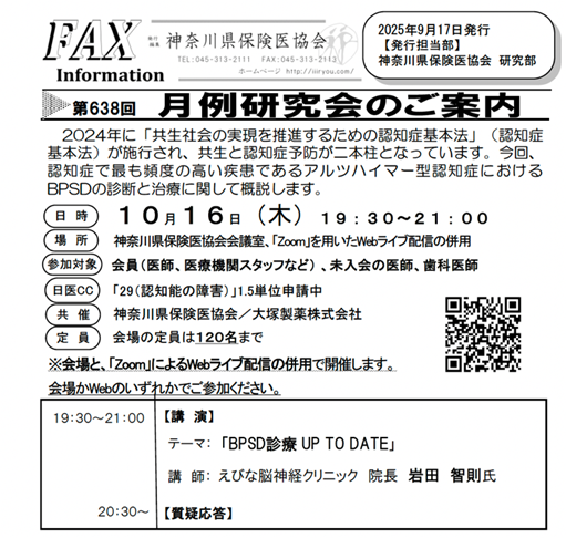 神奈川県保険医協会の第638回月例研究会に参加し、講演をさせて頂きました。横浜からWeb配信されました。認知症診療(特にBPSDに対する診療)に関して講演をさせて頂きました。鎌倉市 章平クリニック 院長 湯浅章平 先生に座長をして頂きました。”アルツハイマー型認知症に伴う焦燥感、易刺激性、興奮に起因する、 過活動又は攻撃的言動”について、国内初となる適応症を取得(効能追加の承認取得)した抗精神病薬「レキサルティ」に関しても講演させて頂きました。平日の夜で、90分弱の講演で長丁場となったにも関わらず、90名以上の先生方が小生の講演を視聴して頂きました。小生の講演が、本会に参加して頂いた先生方の診療の一助になれば幸いです。
