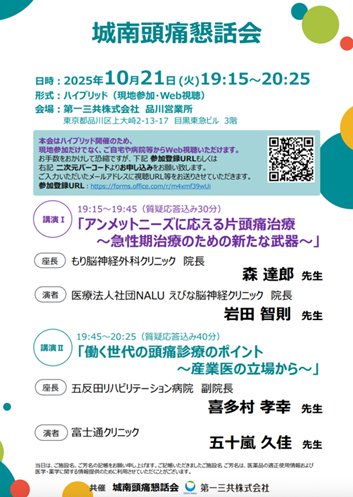 城南頭痛懇話会に参加しました。目黒に直接伺い、講演させて頂きました。もり脳神経外科クリニック 院長 森達郎 先生に座長をして頂き、片頭痛の急性期頓挫療法(主にレイボーの使用実践法)に関して講演をさせて頂きました。小生の講演後に、富士通クリニック 五十嵐久佳 先生の片頭痛診療に関する講演(座長 五反田リハビリテーション病院 副院長 喜多村孝幸 先生)を拝聴しました。五十嵐先生には、論文や講演などで、何度も勉強させて頂いていて、今回も非常に勉強になりました。今年の日本頭痛学会 大会長である東邦大学 心療内科 教授 橋詰勝敬 先生を含めた非常に高名な世話人先生方(牧田総合病院 理事長 荒井好範 先生、昭和医科大学 脳神経内科 講師 笠井英世 先生、吉井クリニック 院長 吉井信哉 先生)と一緒に記念撮影させて頂きました。