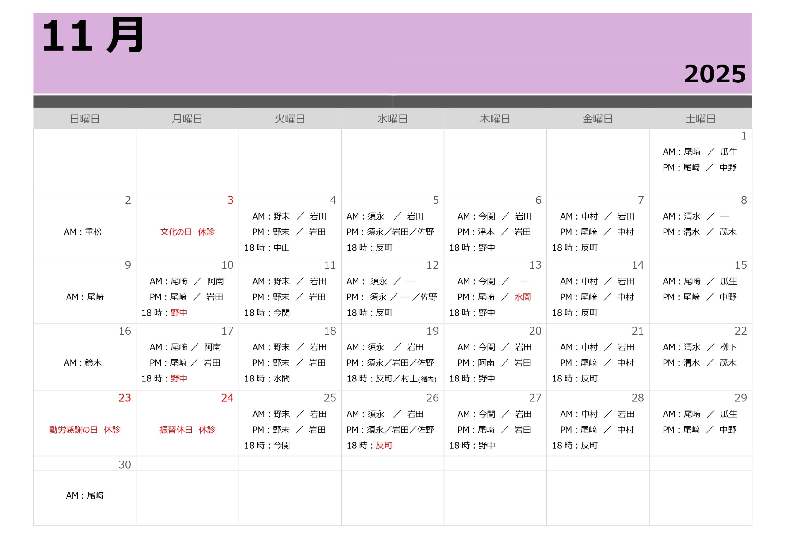 あわせて、11月の夜診療(18:00~21:00)の担当医についても、以下の通りお知らせします。