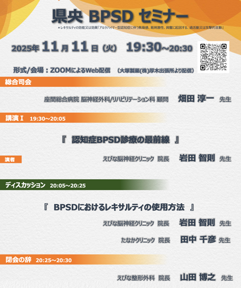 県央BPSDセミナーに参加させて頂きました。座間総合病院 脳神経外科 顧問 畑田淳一 先生(座間市)に座長をして頂き、レキサルティに関する講演をさせて頂きました。たなかクリニック 院長 田中千彦 先生(大和市)と一緒にBPSDの治療の実際についてディスカッションをさせて頂きました。最後に、海老名医師会長 えびな整形外科 院長 山田博之 先生(海老名市)に閉会の辞を頂きました。レキサルティの処方数が右肩上がりで、神奈川県の県央における認知症診療の向上に寄与していることを再認識することができました。