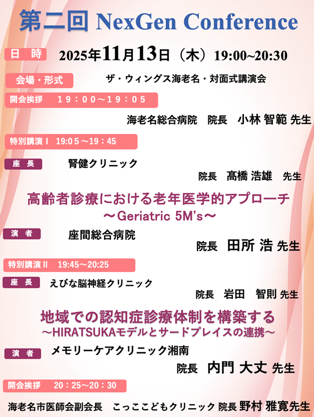 大阪国際会議場でのポスター座長をした直後、隣接のホテルに急いで戻り、第2回 Next Gen  Conferenceに参加しました(移動時間5分)。海老名や座間や綾瀬などの神奈川県 県央を中心とした先生方に集まって頂きました。世代:Generationの垣根を超えた講演会で、今回は診療科の垣根も超えた会となりました。海老名総合病院 院長 小林智範 先生(脳神経外科)のOpening Remarksに始まり、座間総合病院 院長 田所浩 先生(総合内科)の老年内科学の視点からの幅広い内容の講演(座長 腎健クリニック 院長 髙橋浩雄 先生(腎臓内科))を拝聴させて頂きました。続いて、メモリーケアクリニック湘南 院長 内門大丈 先生(精神科)の認知症の市町村レベルでの体制作りに関して勉強させて頂きました。いつも勉強させて頂いていて、認知症専門医の大御所・大先輩である内門先生より大きなモチベーションを頂きました。こっここどもクリニック 院長 野村雅寛 先生(小児科)のClosing Remarksで閉会となりました。大阪からのWeb参加であり、情報交換会に参加できずに非常に残念でした。次回12月開催の第3回Next Gen  Conferenceが今より非常に楽しみです!