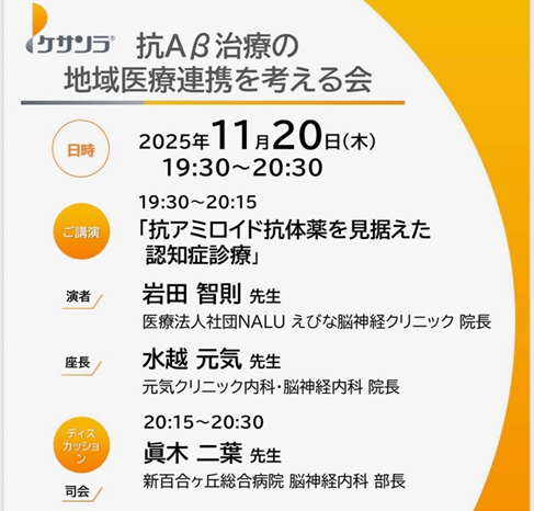 抗Aβ治療の地域医療連携を考える会に参加させて頂きました。新百合ヶ丘(川崎市)で開催され、現地参加させて頂きました。元気クリニック内科・脳神経内科 院長 水越元気 先生(東京都稲城市)に座長をして頂き、抗アミロイドβ抗体薬に関する講演をさせて頂きました。小生の講演後に、新百合ヶ丘 脳神経内科 部長 眞木二葉 先生と水越先生と一緒に認知症の新薬である抗アミロイドβ抗体薬の運用や有効性や地域連携について深くディスカッションをさせて頂きました。