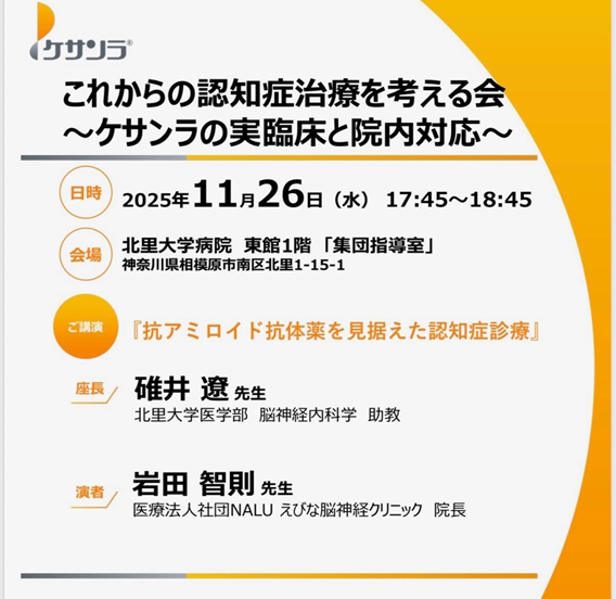 これからの認知症治療を考える会に参加させて頂きました。相模原市の認知症疾患医療センターである北里大学に直接伺い講演させて頂きました。(東海大学勤務時代に新潟大学に伺い講演させて頂いた時以来の)大学での講演であり、非常に緊張しました。新進気鋭の北里大学 脳神経内科 助教 碓井遼 先生に座長をして頂き、抗アミロイド抗体薬に関する講演(ケサンラを中心とした内容)をさせて頂きました。多くの医療関係者の皆様に集まって頂き、意見交換ができ非常に良かったです。これからの認知症診療において、神奈川県央における認知症疾患医療センター同士の密接な連携がスタートできると感じることができました。