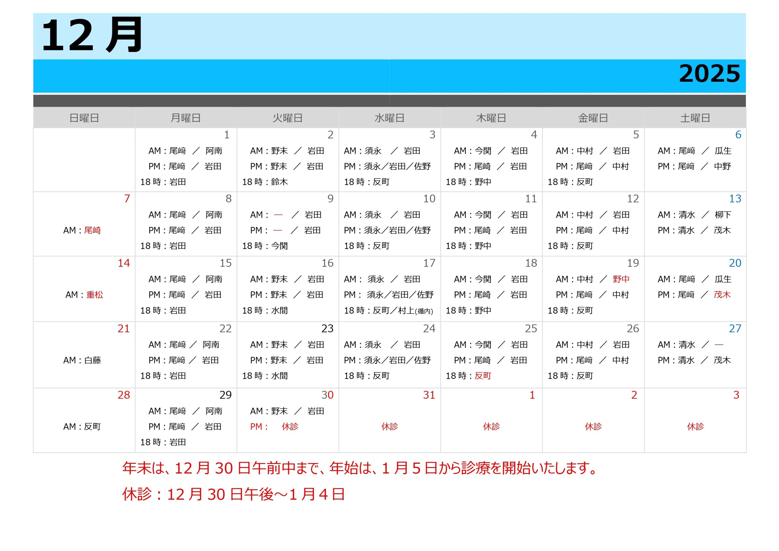 あわせて、12月の夜診療(18:00~21:00)の担当医についても、以下の通りお知らせします。