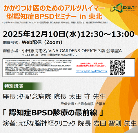 かかりつけ医のためのアルツハイマー型認知症BPSDセミナー in 東北に参加しました。海老名よりWeb配信され、80名を超える東北の先生方に視聴して頂きました。福島県の認知症疾患医療センターである枡記念病院の院長である、太田守 先生に座長をして頂きました。認知症BPSD診療の最前線と題し、最新のガイドラインとレキサルティの有用性に関して講演させて頂きました。小生の講演後、座長の太田先生と実臨床に沿った質疑応答をさせて頂きました。平日昼の多忙な時間にも関わらず、多くに先生方と時間を共有させて頂き、非常に貴重な経験をさせて頂きました。太田先生を含めた関係者各位に感謝申し上げます。