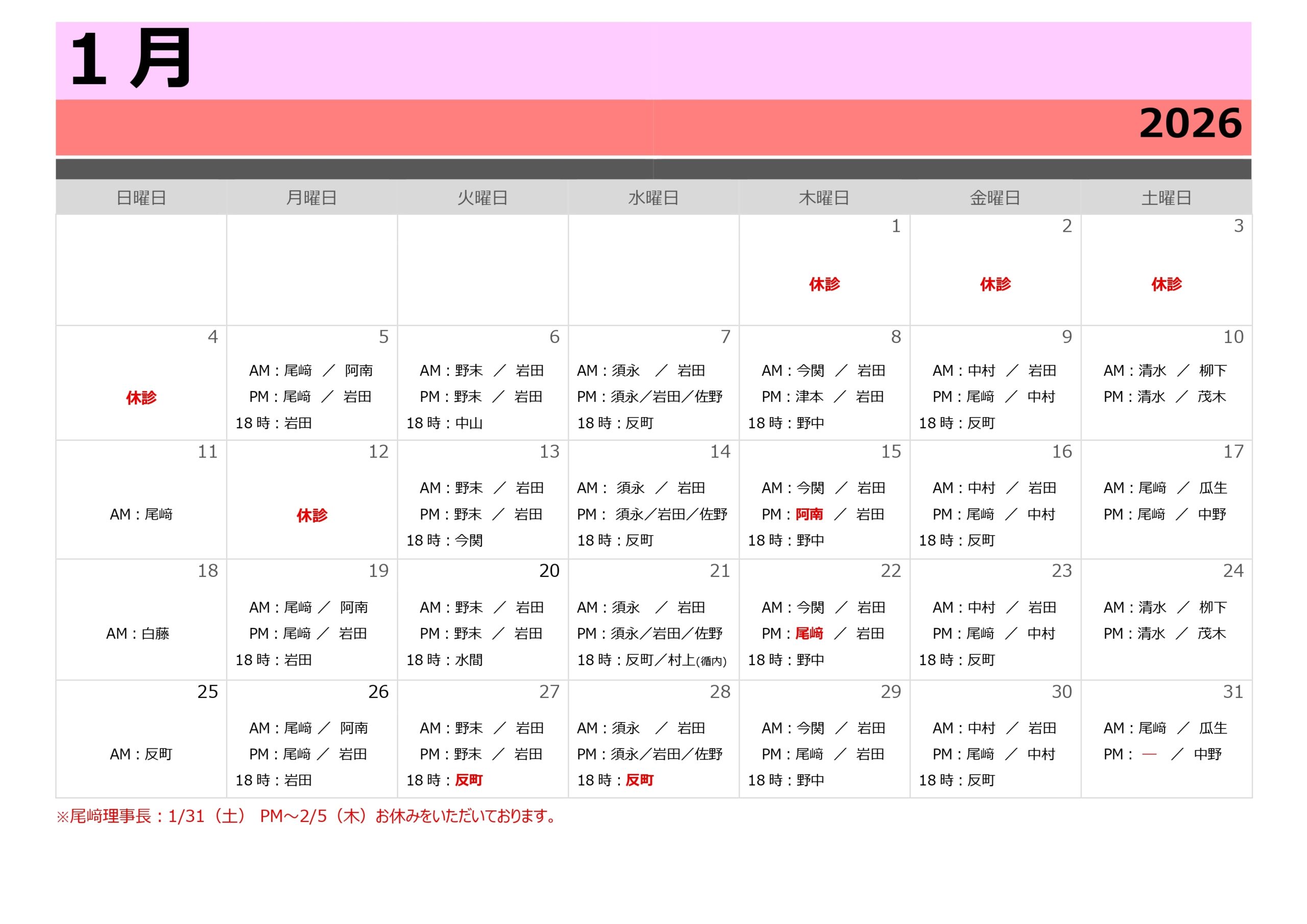 あわせて、1月の夜診療(18:00~21:00)の担当医についても、以下の通りお知らせします。