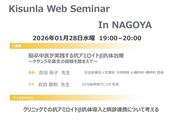 Kisunla Web Seminar in NAGOYAに参加しました。名古屋と海老名をWebで繋ぎ、講演させて頂きました。大同病院 心療内科・精神科 部長吉田裕子 先生に座長をして頂き、ケサンラを中心とした抗Aβ薬に関して講演させて頂きました。