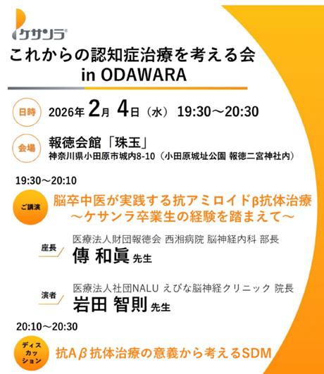 これからの認知症診療を考える会in ODAWARAに参加しました。小田原城に隣接する報徳会館で開催され、現地参加させて頂きました。西湘病院 脳神経内科 部長 傅和眞先生に座長をして頂き、抗Aβ抗体薬の最新データやクリニックでの運用に関して講演をさせて頂きました。Shared decision making(共同意思決定)に関するディスカッションに傅先生と参加させて頂きました。現在、日本有数の脳卒中の症例数を誇る病院で、最先端治療されている傅先生と幅広いディスカッションさせて頂きました。海老名と小田原は特急乗車30分強で、意外に近い都市です。今後の良好な連携に繋がるいい会となりました。