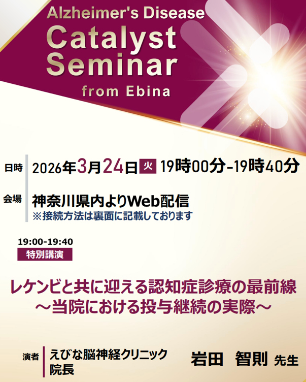 横浜からオンライン配信し、主に神奈川県の先生方に視聴して頂きました。レケンビの18ヶ月を超える延長投与の実際を含めた抗アミロイドβ抗体治療に関して講演をさせて頂きました。